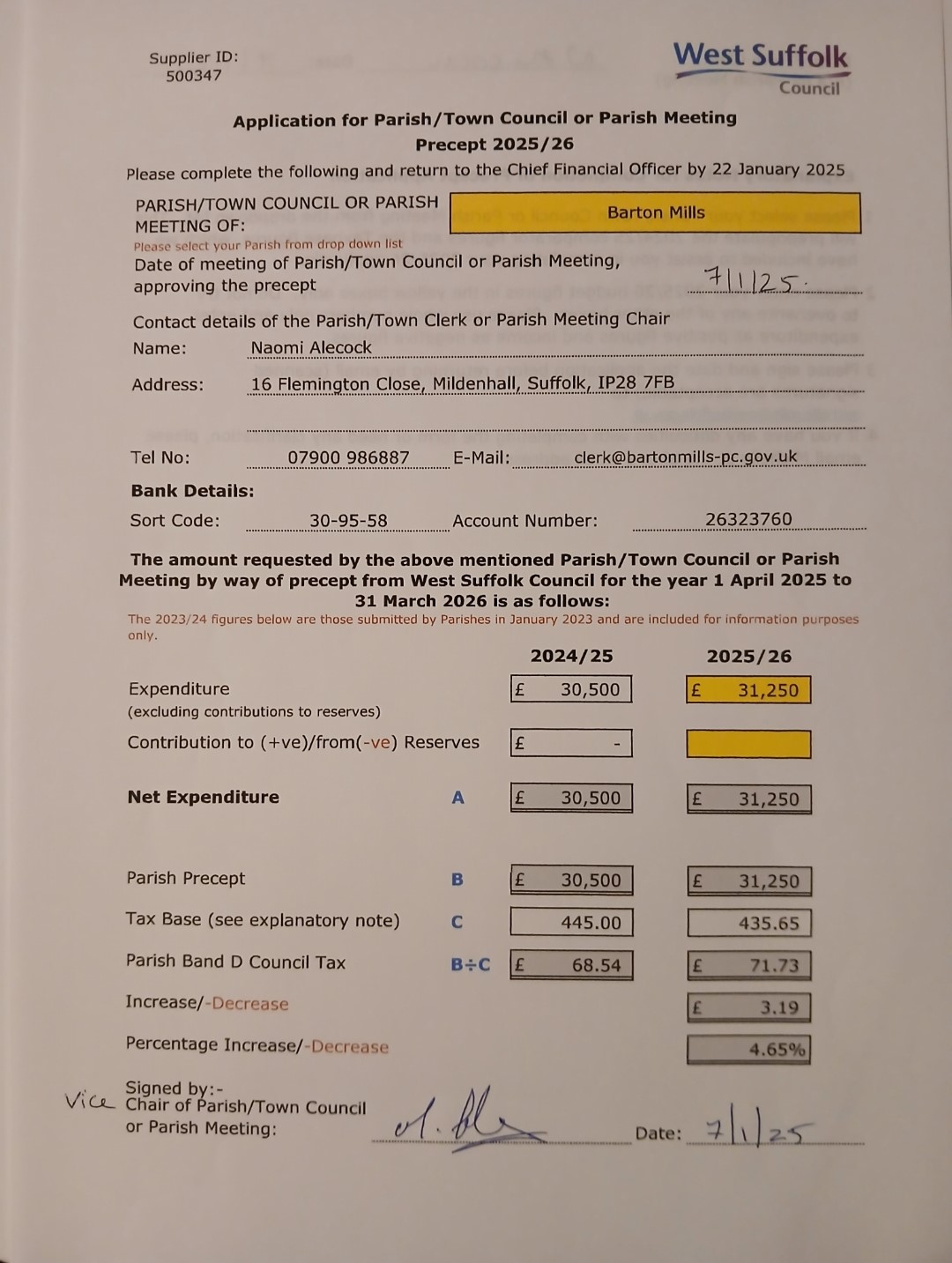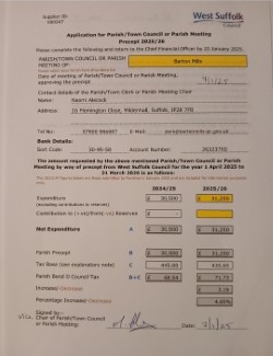 Each year the Parish Council prepares a budget which is approved by the council members, the budget will include the precept amount, which is then submitted to West Suffolk Council. West Suffolk Council give the Parish Council the precept amount in April each year and then they collect the precept via your council tax bill. The Precept money is then used to fund the expenditure made by the Parish Council or to build funds for a larger project.